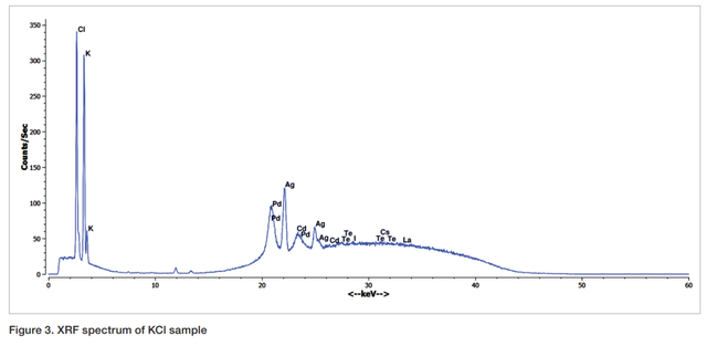 下圖是(KCl)的XRF光譜示例,x-射線管電壓45KV,管目標為Ag。光譜具有幾個與低能量鉀(K)和氯(Cl)譜系相關(guān)的X射線熒光條帶。11.9KeV和13.3KeV附近相對較小的峰可能是樣品中痕量的Ti和Br。