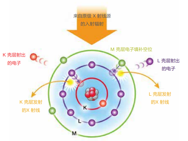 使用從受控x-射線管發(fā)出的高能x-射線照射固體或液體樣品,當樣品中的原子被具有足夠能量(大于該原子K或L殼層結(jié)合能)的x-射線擊中時,原子的內(nèi)軌道殼層中的一個電子會被射出,原子具有較高能量的軌道殼層中的一個電子會內(nèi)軌道殼層中的空位,使該原子重新穩(wěn)定,電子通過釋放熒光x-射線下降到較低能態(tài)。x-射線的能量等于電子的兩個量子態(tài)之間的特定能量差,該能量的測量是XRF分析的基礎(chǔ)。