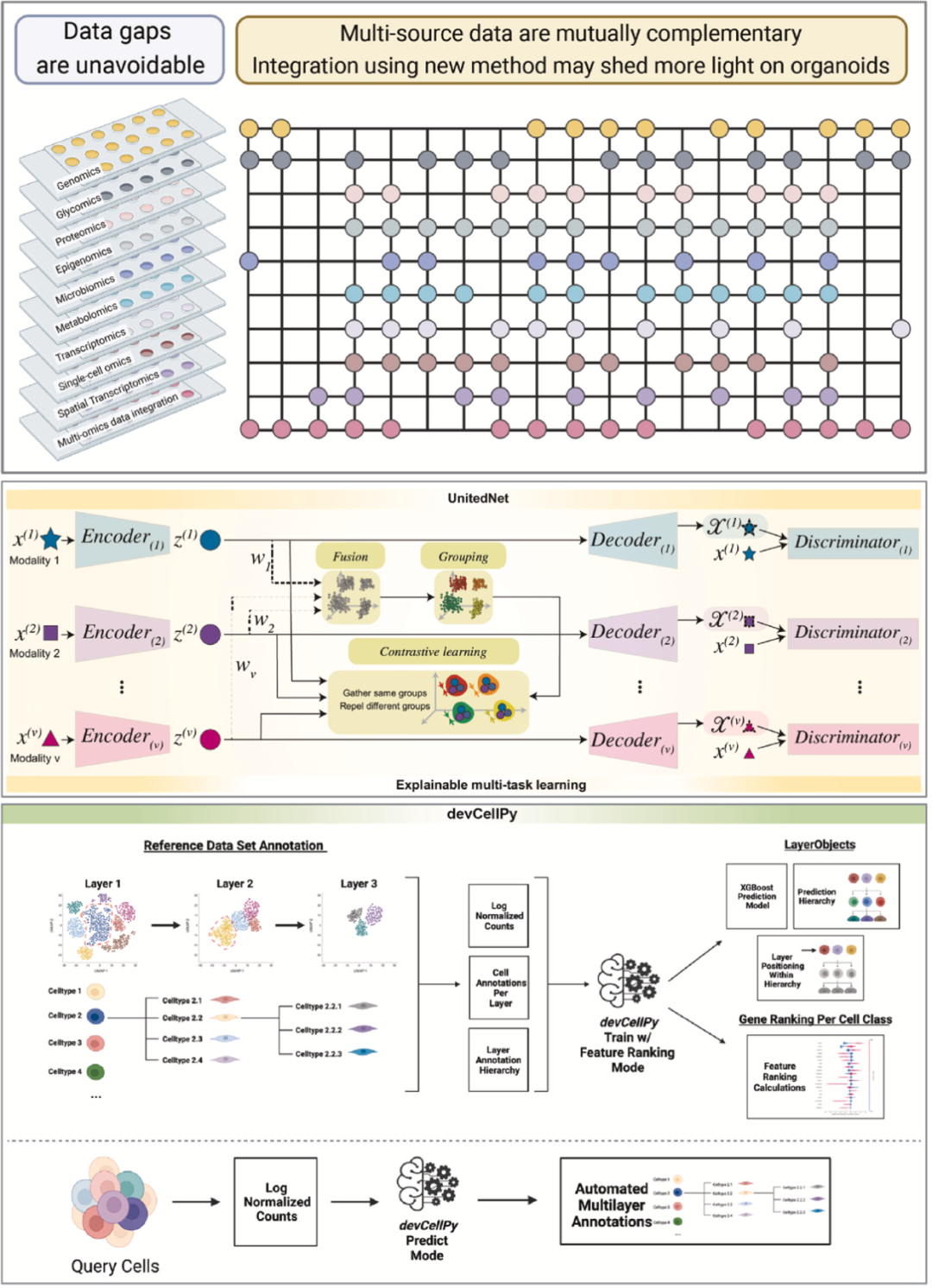 類器官研究的另一個(gè)挑戰(zhàn)是在評(píng)估過(guò)程中分析高通量多組學(xué)數(shù)據(jù)。多組學(xué)數(shù)據(jù)的分析,包括基因組學(xué)、轉(zhuǎn)錄組學(xué)、表觀基因組學(xué)、蛋白質(zhì)組學(xué)和單細(xì)胞組學(xué),由于數(shù)據(jù)量大且復(fù)雜,是一項(xiàng)較為艱巨的任務(wù)。為此,有團(tuán)隊(duì)推出UniedNet,這是一個(gè)可解釋的多任務(wù)深度神經(jīng)網(wǎng)絡(luò),旨在合并各種任務(wù),以評(píng)估單細(xì)胞多模態(tài)數(shù)據(jù)。最近的另一篇文章介紹了devCellPy,這是一種機(jī)器學(xué)習(xí)支持的工作流程,用于自動(dòng)標(biāo)記復(fù)雜的多層單細(xì)胞轉(zhuǎn)錄組數(shù)據(jù),有助于在復(fù)雜的層次結(jié)構(gòu)中自動(dòng)識(shí)別細(xì)胞類型。
