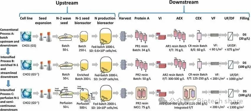 2020年5月發(fā)表在mAbs上的“Biomanufacturingevolution from conventional to intensified processes for productivityimprovement: a casestudy"文章中,美國(guó)百時(shí)美施貴寶公司分享了一個(gè)從傳統(tǒng)到強(qiáng)化工藝的生產(chǎn)力提升案例,通過(guò)使用CHO細(xì)胞生產(chǎn)單克隆抗體,展示了三種工藝的比較:傳統(tǒng)補(bǔ)料分批工藝(工藝A,1000L規(guī)模)、N-1強(qiáng)化補(bǔ)料分批工藝(工藝B,1000L規(guī)模)以及N-1灌流強(qiáng)化補(bǔ)料分批工藝(工藝C,2000L規(guī)模)。其中,工藝C在上游階段采用了N-1灌流技術(shù),并在下游引入多柱層析(MCC)和集成精純步驟,顯著提升了生產(chǎn)效率。該工藝展現(xiàn)出良好的可擴(kuò)展性,并通過(guò)工藝優(yōu)化有效降低了生產(chǎn)成本,為未來(lái)實(shí)現(xiàn)全面連續(xù)化生產(chǎn)奠定了堅(jiān)實(shí)的基礎(chǔ)。