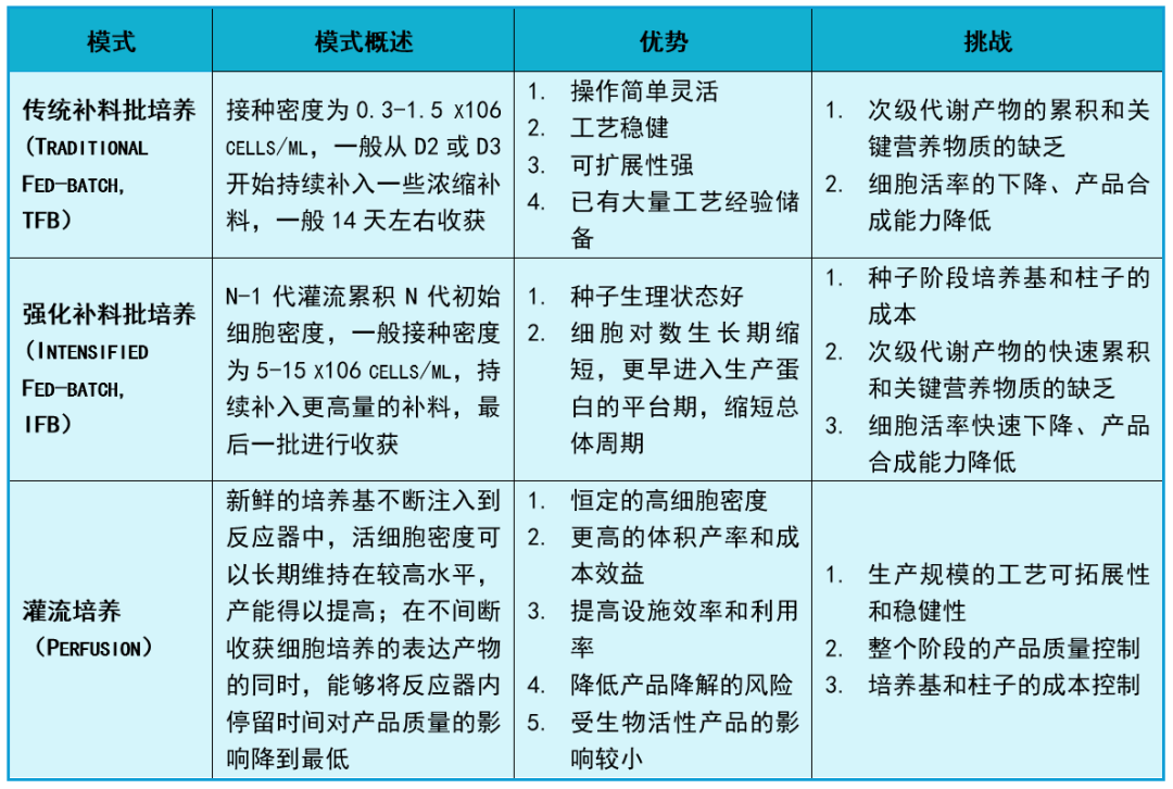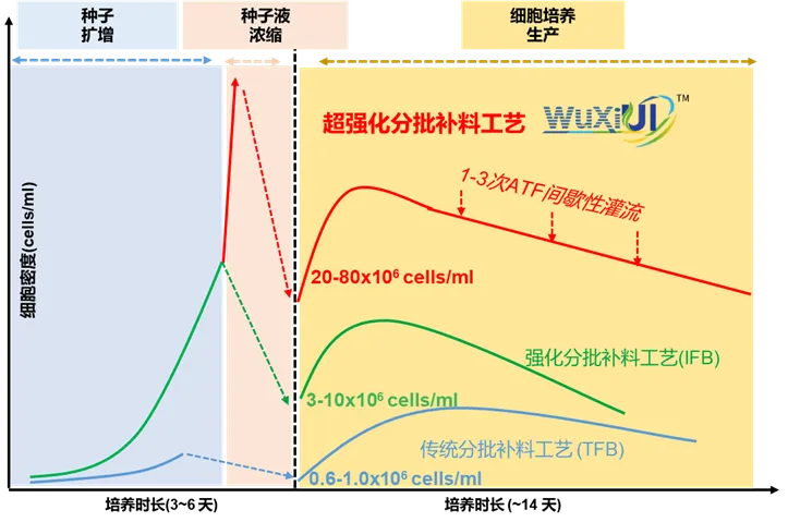 注:工藝A采用傳統(tǒng)補(bǔ)料分批培養(yǎng),工藝B在N-1階段采用批量培養(yǎng)或補(bǔ)料分批培養(yǎng)方式來(lái)提升的N階段細(xì)胞接種密度,工藝C在N-1種子培養(yǎng)階段引入灌流操作來(lái)提升的N階段細(xì)胞接種密度