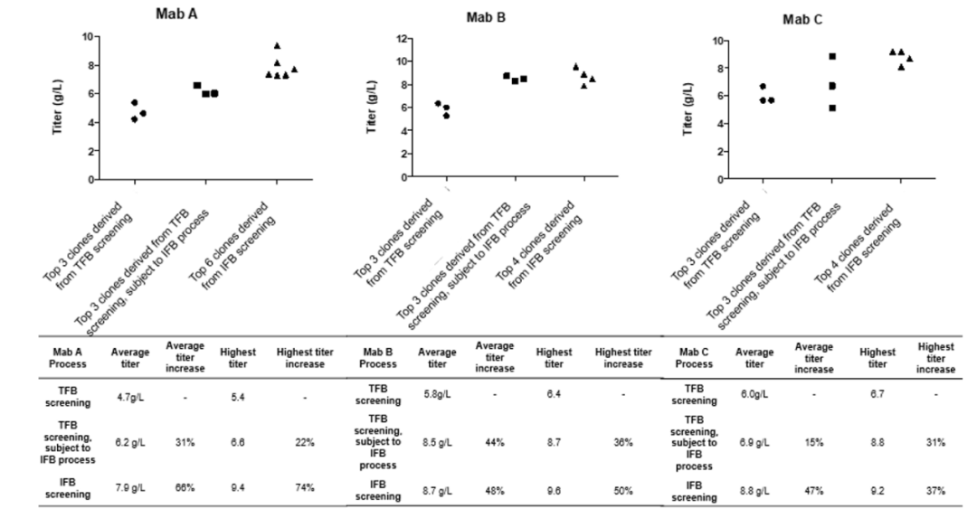最近在BiotechnologyProgress上發(fā)表了題為“Establishmentof a high-throughput scale-down clone screening platform forintensified fed-batch culture of CHOcells"的研究論文中也提到過(guò)IFB平臺(tái)相比于TFB平臺(tái)的產(chǎn)量有著顯著的提升。在實(shí)驗(yàn)中,使用了三種單克隆抗體(mAbA、B和C),結(jié)果表明,與傳統(tǒng)補(bǔ)料批次(TFB)工藝相比,IFB工藝能夠顯著提高產(chǎn)量,最高可增加至9.6g/L。