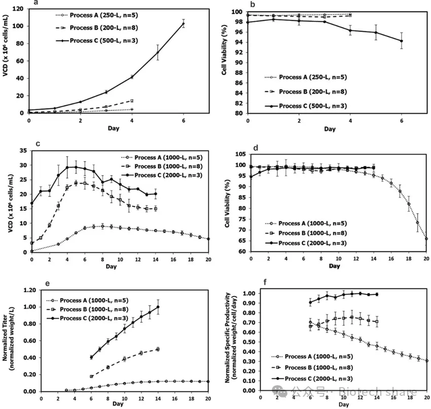 作者比較了N-1階段種子培養(yǎng)在不同工藝下的活細(xì)胞密度(VCD)、細(xì)胞活力以及后續(xù)補(bǔ)料分批生產(chǎn)的性能。結(jié)果顯示,在200L至500L規(guī)模中,傳統(tǒng)補(bǔ)料分批工藝A的VCD為4.29±0.23×10?cells/mL,而通過(guò)強(qiáng)化的工藝B和工藝C,VCD顯著提高,分別達(dá)到了14.3±1.5×10?cells/mL和103±4.6×10?cells/mL,尤其是工藝C,顯示出灌流技術(shù)對(duì)細(xì)胞擴(kuò)增的顯著積極作用(圖a)。盡管工藝A和B的細(xì)胞活力差異不大,工藝C的細(xì)胞活力略有下降,但未對(duì)后續(xù)的生產(chǎn)培養(yǎng)造成顯著影響(圖b)。在1000L至2000L規(guī)模中,工藝C的最高VCD達(dá)到了29.3±2.19×10?cells/mL,遠(yuǎn)高于工藝A和B(圖c和d),表明工藝C在大規(guī)模培養(yǎng)中同樣表現(xiàn)優(yōu)異。此外,工藝C的標(biāo)準(zhǔn)化產(chǎn)量和細(xì)胞特異性產(chǎn)量也顯著高于工藝A和B(圖e和f),較工藝A和B分別增加了8倍和2倍,說(shuō)明通過(guò)引入N-1強(qiáng)化工藝,生產(chǎn)效率得到了大幅提升。