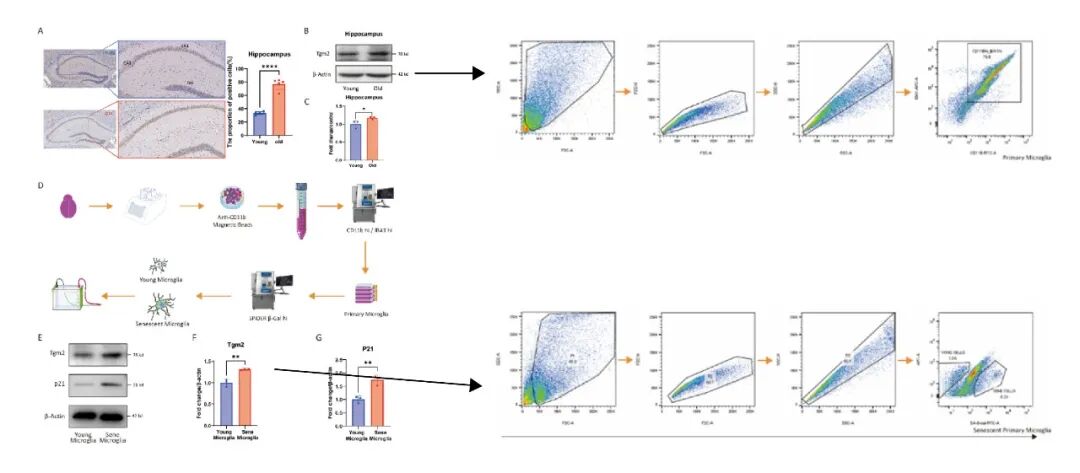 老年 (22 mo) C57/B6小鼠, 藥物處理獲得BV2衰老細(xì)胞模型, 構(gòu)建Tgm2敲低BV2細(xì)胞系;