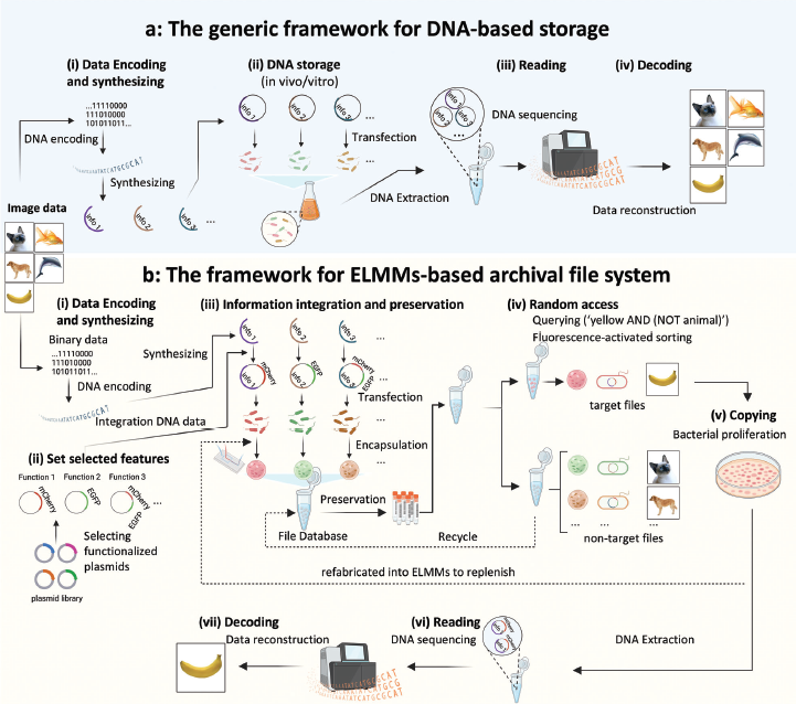 本研究提出了一種創(chuàng)新的DNA數(shù)據(jù)存儲(chǔ)系統(tǒng), 該系統(tǒng)基于攜帶彩色熒光標(biāo)記的工程化活體存儲(chǔ)微球(Engineered Living Memory Microspheroids, 簡稱ELMM),被研究人員形象地稱為“細(xì)菌彩珠硬盤"。研究人員將數(shù)據(jù)編碼為DNA序列并插入可表達(dá)eGFP或mCherry等熒光蛋白的質(zhì)粒中,隨后將其轉(zhuǎn)化至細(xì)菌內(nèi)部,再將這些細(xì)菌快速封裝于水凝膠微球中,即得 “細(xì)菌彩珠硬盤",這些ELMM可在室溫干燥環(huán)境中長期且安全保存。當(dāng)需要檢索數(shù)據(jù)時(shí), 研究人員使用熒光激活流式分選 (FACS) 方法, 根據(jù)熒光蛋白信號(hào)對ELMM進(jìn)行分選和細(xì)菌擴(kuò)增, 最后再對細(xì)菌進(jìn)行測序和解碼以恢復(fù)原始數(shù)據(jù);未使用的細(xì)菌可重新制成ELMM,形成流程閉環(huán)。這一創(chuàng)新的DNA數(shù)據(jù)存儲(chǔ)系統(tǒng),涵蓋了數(shù)據(jù)編碼與合成、特征設(shè)定、信息整合與保存、隨機(jī)訪問、復(fù)制、讀取與解碼等完整流程。