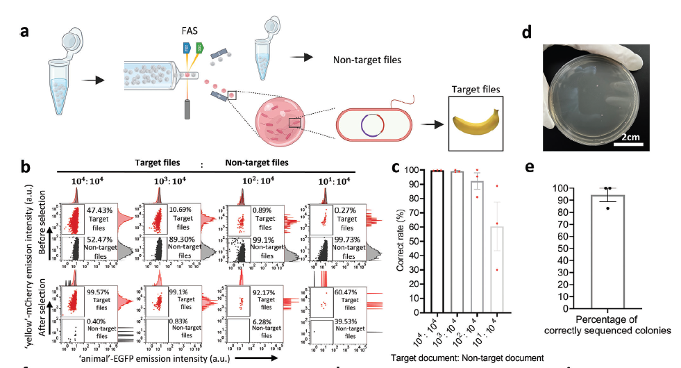 該研究的核心內(nèi)容為制備“細(xì)菌彩珠硬盤"和驗(yàn)證熒光激活分選方法的高效檢索能力。研究人員選取了不同的圖像數(shù)據(jù)編碼為DNA序列, 最終制備為直徑47.03μm的ELMM,并進(jìn)行了3個(gè)月室溫干燥保存和多達(dá)7次的凍干-復(fù)水循環(huán)測試, 驗(yàn)證其長期穩(wěn)定和可重用性。而在數(shù)據(jù)檢索環(huán)節(jié),研究人員設(shè)計(jì)了基于eGFP/mCherry/TagBFP等熒光蛋白信號(hào)的布爾邏輯檢索測試,并采用配備150 µm噴嘴的Bigfoot全光譜流式細(xì)胞分選儀對直徑近50μm的ELMM進(jìn)行熒光激活流式分選。通過對分選后細(xì)菌進(jìn)行培養(yǎng)和DNA測序, 結(jié)果表明分選準(zhǔn)確率>98%,分選靈敏度可達(dá)0.1%; 即使在目標(biāo)數(shù)據(jù)僅10個(gè)拷貝的情況下, 數(shù)據(jù)也能被準(zhǔn)確檢索(見圖2)。