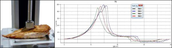 實驗可分為平行雞肉纖維方向和垂直雞肉纖維方向剪切,通過剪切實驗可以得出雞肉纖維切割硬度,最大咬合阻力等??捎糜诒容^烹飪時間的長短、烹飪方式的不同對雞胸肉的肌肉硬度、咬合力等的影響,從而找出最佳的雞胸肉烹調(diào)方式和時間。