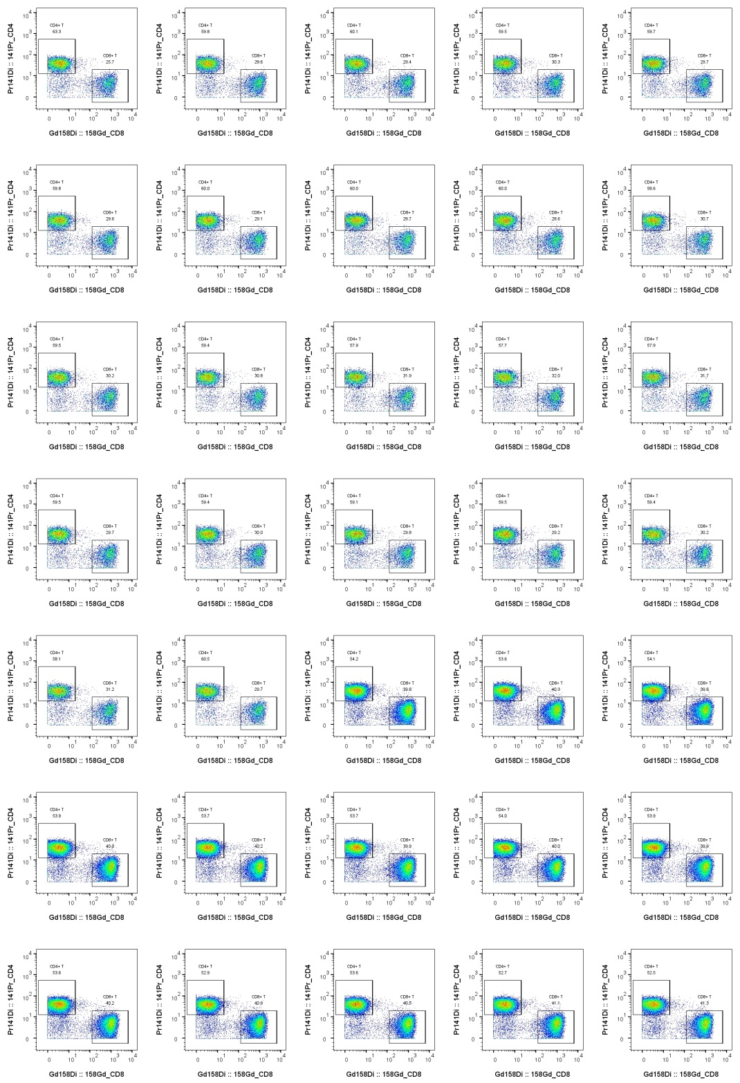 (3)對解碼后35個樣本進(jìn)行CD4/CD8 T cells、B cells、Monocytes和NK cells分群圈門,各細(xì)胞亞群分群效果較好,亞群比例統(tǒng)計結(jié)果如下:解碼后的35個樣本以CD4/CD8 T細(xì)胞為例的分群效果:譜康醫(yī)學(xué) MSFLO 質(zhì)譜流式細(xì)胞儀致力于為生命科學(xué)領(lǐng)域提供強(qiáng)大的單細(xì)胞、多靶標(biāo)檢測技術(shù)手段,滿足單細(xì)胞 40 色及以上檢測指標(biāo)需求,且通道間基本無串?dāng)_、無需調(diào)節(jié)補(bǔ)償,背景信號低,工作模式豐富,為不同科學(xué)研究領(lǐng)域提供強(qiáng)有力的技術(shù)解決方案。聚光科技生命科學(xué)板塊旗下杭州譜康醫(yī)學(xué)科技有限公司,成立于2020年,以流式細(xì)胞檢測技術(shù)為核心,提供專業(yè)化的硬件及配套試劑,同時為客戶開發(fā)開展定制化服務(wù)。公司堅持流式細(xì)胞儀產(chǎn)業(yè)化協(xié)同發(fā)展戰(zhàn)略,擁有高學(xué)歷流式設(shè)備專業(yè)研發(fā)團(tuán)隊(duì),標(biāo)準(zhǔn)化的GMP生產(chǎn)車間,豐富的實(shí)驗(yàn)室建設(shè)經(jīng)驗(yàn),成熟的實(shí)驗(yàn)室管理體系,已經(jīng)全面掌握流式核心的設(shè)備制造技術(shù)及設(shè)備集成的開發(fā)能力,旨在為客戶提供整套細(xì)胞解決方案。